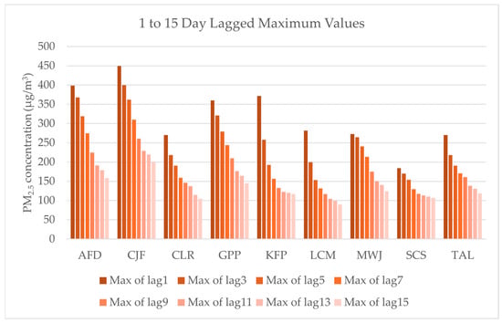 Daily mean PM2.5 concentrations at a 4 km resolution derived from airshed scaling factors were applied to values measured from the associated monitor. For each date, we calculated backward-looking moving averages of PM2.5 concentrations over various time windows, including 3-, 5-, 7-, 9-, 11-, 13-, and 15-day periods. This approach examines the potential delayed health effects of air pollution exposure, which is particularly relevant for respiratory and cardiovascular conditions, where physiological responses may develop over time. As shown in Figure 4, particularly through the Klamath Falls Peterson Elementary (KFP) and Shady Cove School (SCS) monitors, the upper range of the average of the daily maximum values begins to even out after about two weeks. In conjunction with previous results noting health impacts increasing across a similar lag time in this study area [17], these results informed our decision to extend the analysis to a maximum of 15 days.