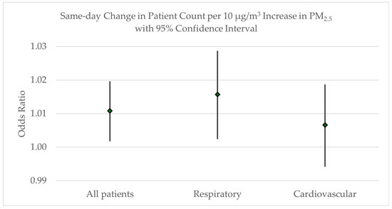 Odds ratio with 95% confidence intervals for the same-day increase in patient counts related to the increase in PM2.5 concentrations.