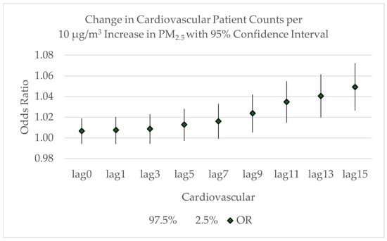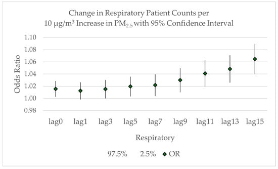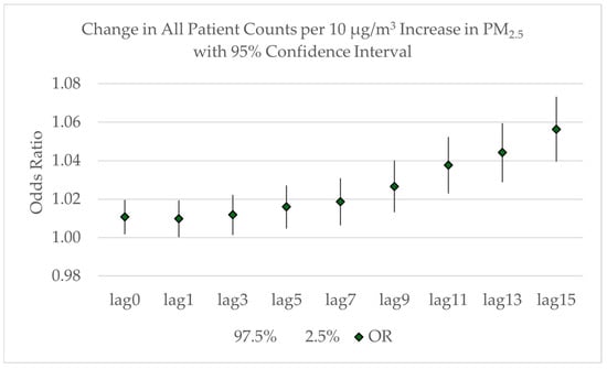 Rolling averages were calculated for odd numbers of days from 1 through 15 to extend to an average of just over two weeks. A lag of 0 indicates same-day admissions. As shown in Figure 6, the increase in all patient counts approached non-significance with a 1-day lag (OR = 1.0098; 95% CI: 1.0001–1.0193). Then, the odds ratio increased with each exposure period to an expected 5.6% increase in admissions with a 10 μg/m3 increase the average PM2.5 across a 15-day lag (OR = 1.0563; 95% CI: 1.0396–1.0732). This corresponds to an additional 0.28 patients.