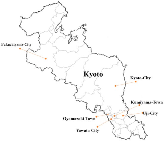 Environmental monitoring data—B(a)P, SPM, and meteorological data—from four cities (Kyoto, Yawata, Fukuchiyama, and Uji); five wards in Kyoto City (Kita, Nakagyo, Ukyo, Sakyo, and Yamashina); and two towns (Kumiyama and Oyamazaki) within Kyoto Prefecture over January 2001–December 2021 were obtained from the public platforms of the National Institute for Environmental Studies (NIES) (https://tenbou.nies.go.jp/) (accessed on 6 June 2024) and the Japan Meteorological Agency (JMA) (https://www.data.jma.go.jp/stats/etrn/index.php) (accessed on 6 June 2024). The geospatial boundaries of administrative units (cities and towns) were derived from the digital map database provided by the Geospatial Information Authority of Japan (GSI) (https://www.gsi.go.jp/gis.html) (accessed on 7 May 2025) in Figure 1. SPM refers to airborne particles with an aerodynamic diameter of ≤10 µm. SPM is predominantly used in Japan for air quality monitoring and regulation.