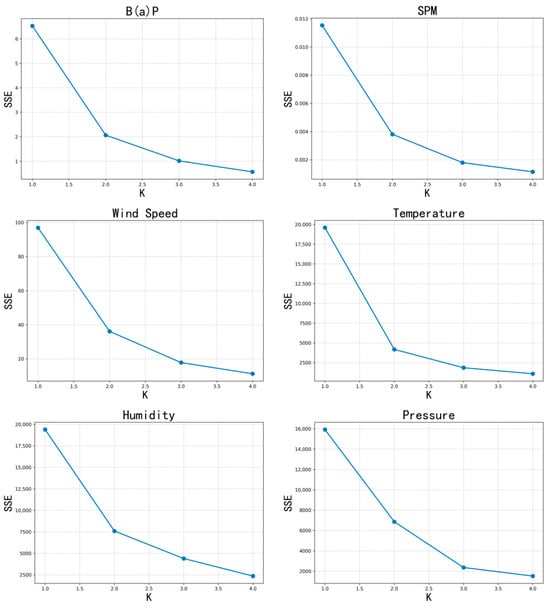 A Python-based program (Python 3.7.7; PyCharm Community 2020.1, JetBrains) was developed to perform clustering on various data based on the SSE principle. Figure 2 shows the elbow plot representing the optimal K values. Based on the inflection points of data and the original data properties, K = 3 was deemed the best clustering configuration. The factors were categorized into three intervals—low, medium, and high. As shown in Figure 2, when K = 4, the SSE value is the lowest. However, upon dividing the data into four categories (the values of data are from low to high), substantial differences were observed in the distribution of data across intervals, resulting in a classification outcome that could provide insufficient quality for subsequent association rule mining. Table 1 shows the final grading, where B, SP, T, H, and P denote the B(a)P concentration (ng/m3), SPM concentration (mg/m3), wind speed (m/s), temperature (°C), H humidity (%), and pressure (hPa), respectively. Table 2 shows the results of data mining. Wind direction was excluded herein due to its considerable temporal variations.