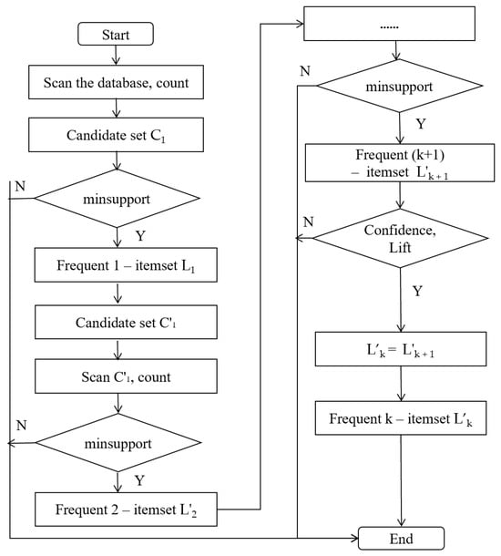 Figure A1 shows the flowchart of Apriori algorithm that scans the database each time a frequent itemset is obtained. Consequently, the traditional Apriori algorithm is limited to handling datasets with few categories and small data volumes. In cases wherein numerous categories and large data volumes are involved, the disk performance of typical computers may not be able to manage the multiple database scans; this considerably reduces the computational efficiency. Therefore, the original algorithm structure must be optimized. To meet the minimum confidence criteria, the Apriori algorithm often unveils association rules that do not align with the actual research scenario when interpreting some strong association rules. For instance, in a dataset containing 100 entries, where the influencing factor X appears 60 times and the outcome Y appears 80 times as well as X and Y co-occurring 40 times, the probability of X and Y occurring together is 40%. Given the presence of X, the probability of Y occurring is 67%. Contrarily, without X, the probability of Y occurring is 80%. This suggests that the presence of X decreases the probability of Y, implying that X and Y are not associated. In addition to confidence, other metrics also need to be integrated.