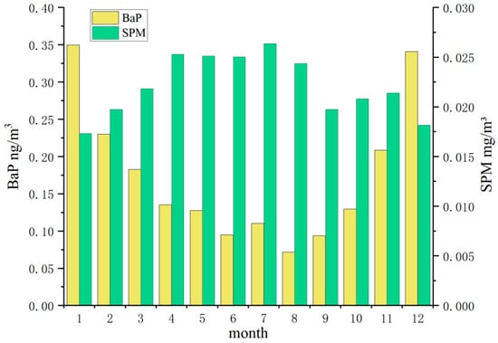 In contrast to B(a)P, SPM exhibited an opposite seasonal trend, with higher monthly averages in warm seasons. This divergence arises from the following distinct physicochemical drivers: