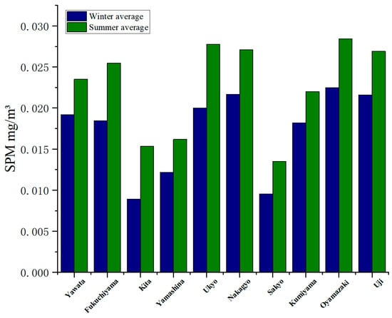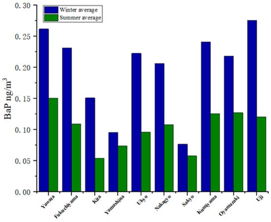 High B(a)P concentrations were observed because industrial parks in cities such as Yahata City and Fukuchiyama City generate high amounts of pollutants. These industrial parks are surrounded by abundant transportation hubs, and transportation logistics rely more on heavy-duty trucks that use diesel fuel. These factors are accompanied by unfavorable meteorological conditions such as atmospheric stability layers, low wind speed, or lack of precipitation during the cold season. In contrast, the average SPM was lower (by approximately half) in the cold season than in the warm season. The seasonal variations in B(a)P and SPM concentration were mainly due to differences in their sources and atmospheric behavior mechanisms. The seasonal variations in B(a)P were highly influenced by fuel combustion emissions and photochemical degradation, whereas those in SPM were influenced by secondary particulate matter generation and dust lifting.