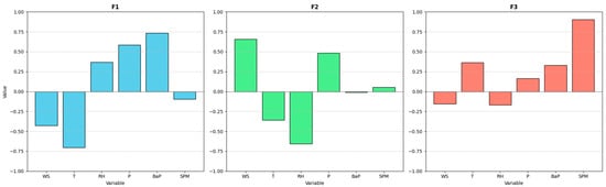 Figure 7 shows the correlation matrix of the PCA; temperature and wind speed exhibit a significant negative correlation with B(a)P concentration, indicating that low temperature and low wind speed may reduce the dispersion and dilution of pollutants, resulting in higher B(a)P concentrations. Atmospheric pressure has a moderate positive correlation with B(a)P concentration likely owing to pollutant accumulation under high-pressure conditions. Humidity has a weak positive correlation with B(a)P, potentially reflecting the influence of particle adsorption characteristics. Moreover, a strong association between B(a)P and SPM concentrations is observed. Table 6 shows the variance analysis of PCA. The eigenvalues C1 = 1.701, C2 = 1.226, and C3 = 1.132 and the cumulative variance contribution rate of the first three principal components reached 67.655%, covering most information. This indicated that the first three principal components in Table 7 represented the initial indicators for analysis. These three indicators were, therefore, denoted as F1, F2, and F3.