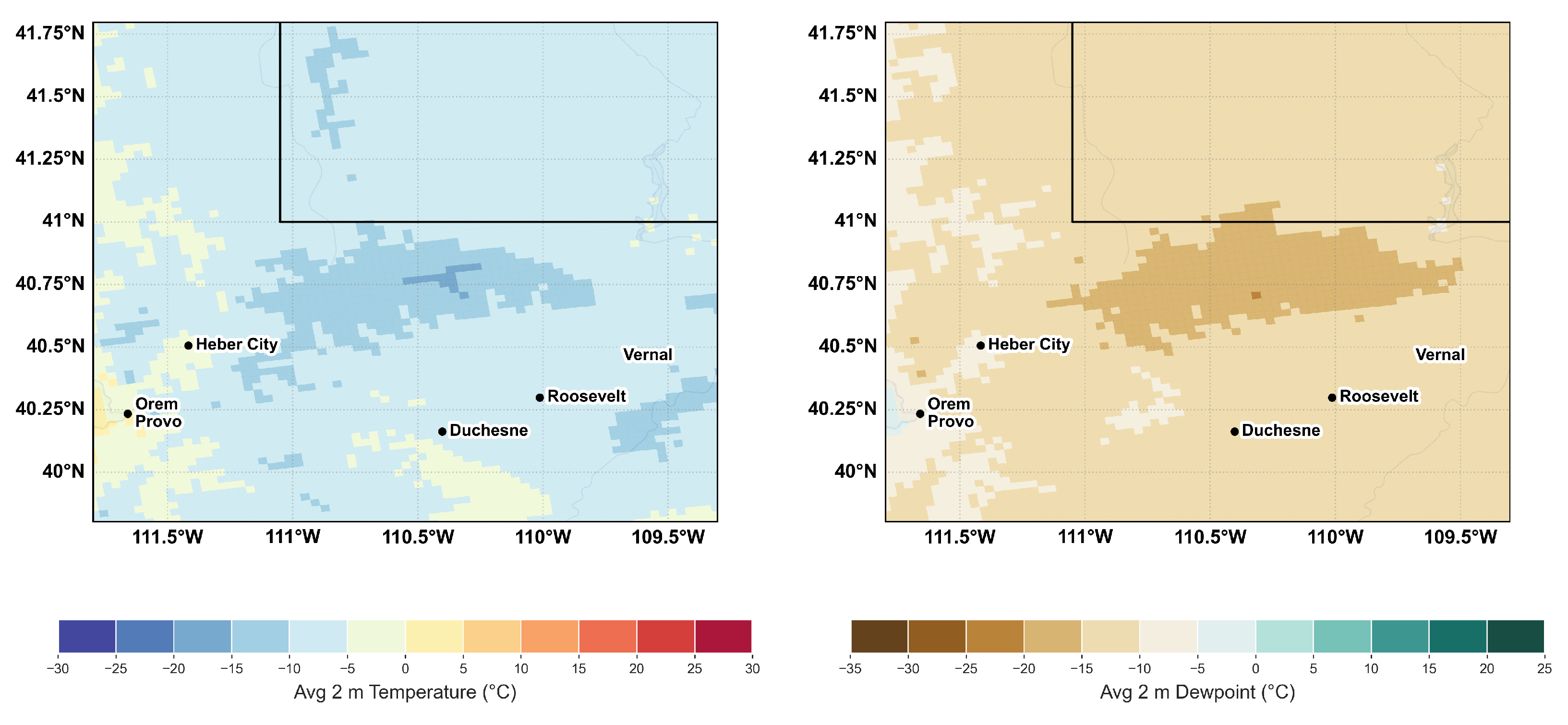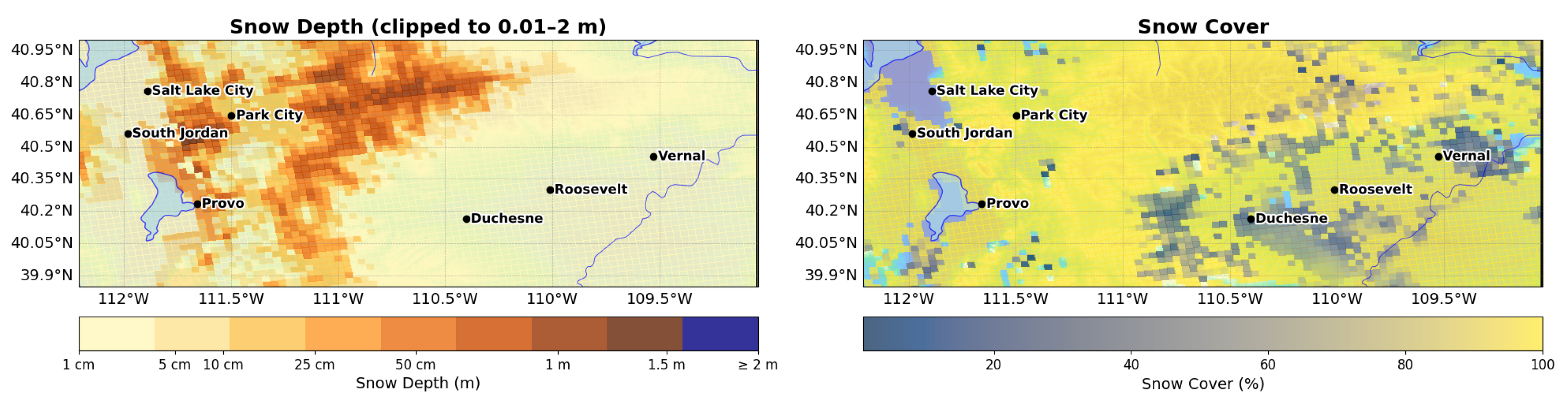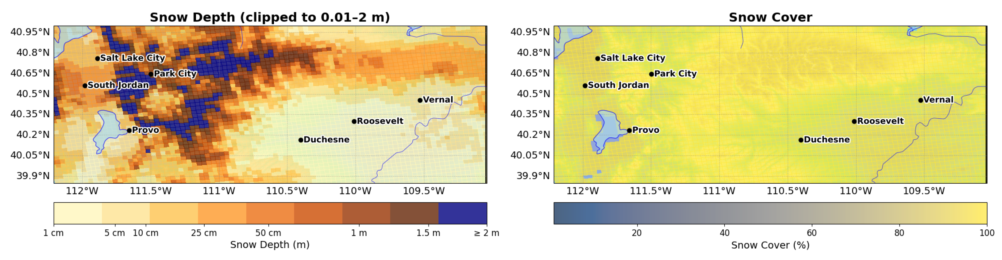 - Do we find evidence of a Uinta Basin snow shadow? This would appear as less snow in the lee of the Wasatch than on the windward slopes, the challenge of a fair comparison in varying terrain notwithstanding;