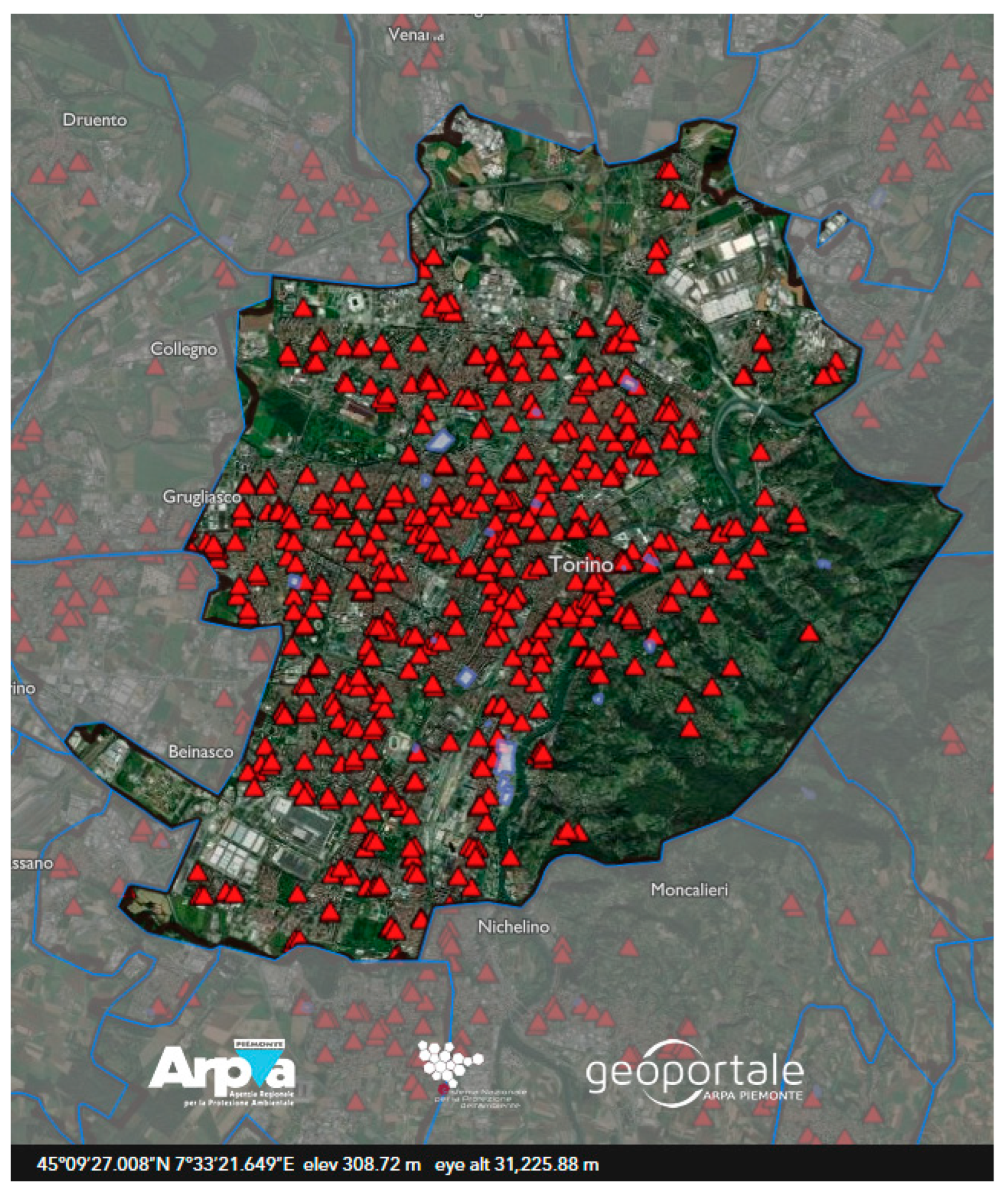 Section 4, which focuses on a possible application of the proposed method in the city of Turin (northwestern Italy), an open-access georeferenced database developed by Regione Piemonte was used to identify sensitive receptors: namely, schools and hospitals within the city [