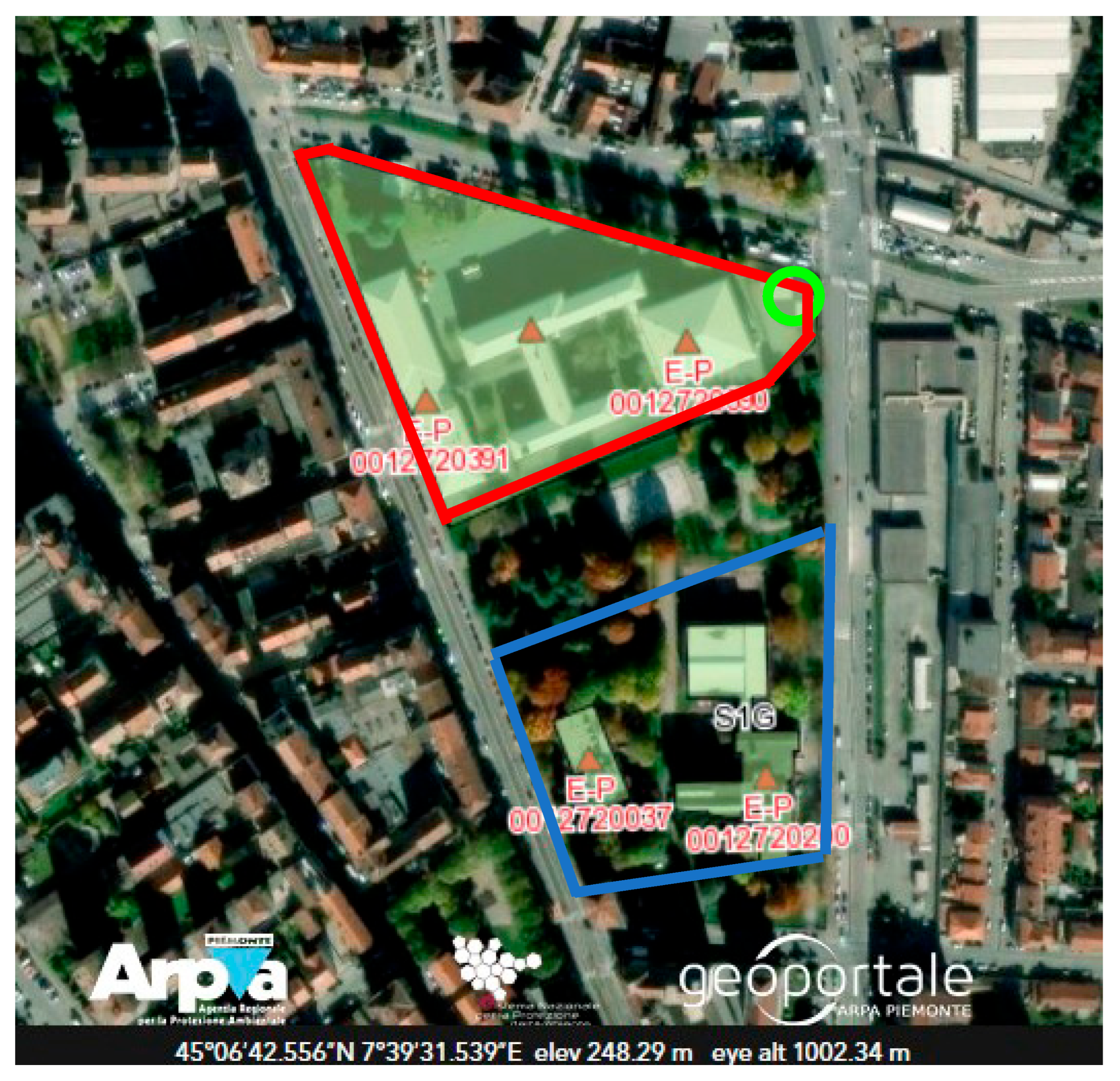 Table 6, the use of ASCs to mitigate air pollution episodes in Turin appears to be technically viable and economically sustainable, within the range of 22 to 164 sprayers. Nevertheless, the wide variation in estimated installation and operating costs highlights the need for empirical validation. We therefore propose the installation of a pilot ASC at ITTS “Carlo Grassi” High School, located in the northwestern sector of the city. Although it belongs to risk class 4, it lies adjacent to the “Torino Grassi” air quality monitoring station (see