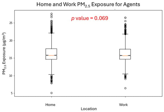 Differences in exposure between home and work locations approached significance (p = 0.069) but did not reach the 0.05 threshold. Our spatial-equity design distributed agents randomly across residential and workplace parcels, minimizing systematic home-work exposure differences. In practice, occupational segregation, zoning, and the siting of industrial land would amplify these differences—workers in logistics, manufacturing, warehouse, and freeway-adjacent jobs disproportionately face higher exposure. Under real structural conditions, these gradients compound vulnerability.