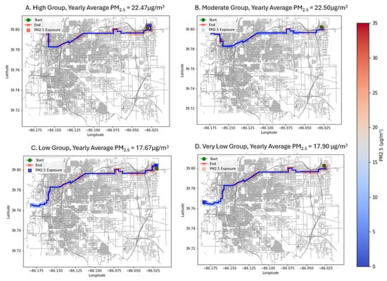 To evaluate whether mobility decisions could decrease exposure under spatial equity, we compared the shortest route between home and work with an alternative route optimized to reduce PM2.5 (Figure 8). The shortest route covered 5.21 miles, while the exposure-minimizing route extended to 7.61 miles, representing a roughly 46% increase in distance to avoid higher-pollution road segments.