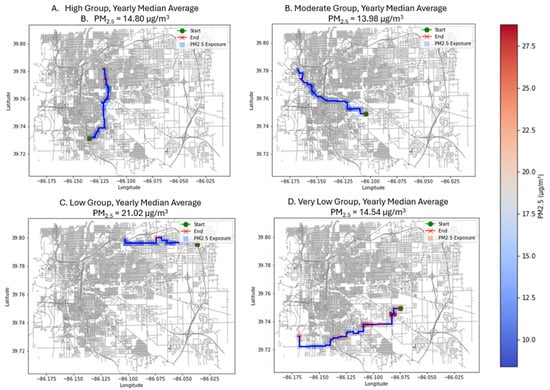 To further examine how mobility through the urban environment influences exposure under spatial equity, we mapped the highest-exposed and median-exposed agents within each susceptibility group (Figure 5 and Figure 6). These route-based visualizations illustrate how travel pathways intersect with localized PM2.5 gradients in the Pleasant Run airshed.
