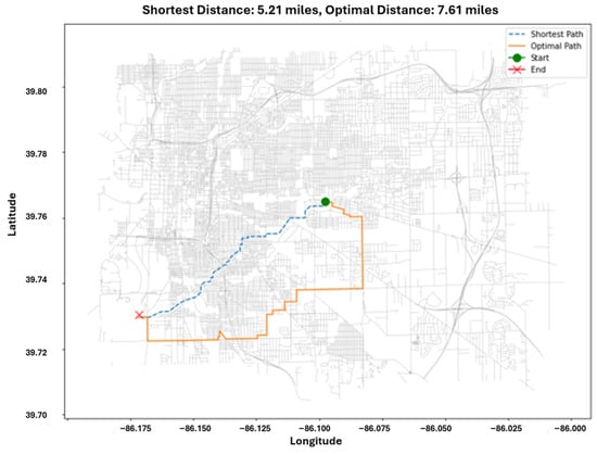 Example of route optimization comparing shortest-distance path (5.21 miles) with exposure-minimizing path (7.61 miles; 46% longer). Although the optimized path traverses areas with lower average PM2.5 concentrations, cumulative exposure may remain similar or increase due to longer travel distance and greater number of grid cells encountered, illustrating the distance-exposure trade-off discussed in Section 4.4.