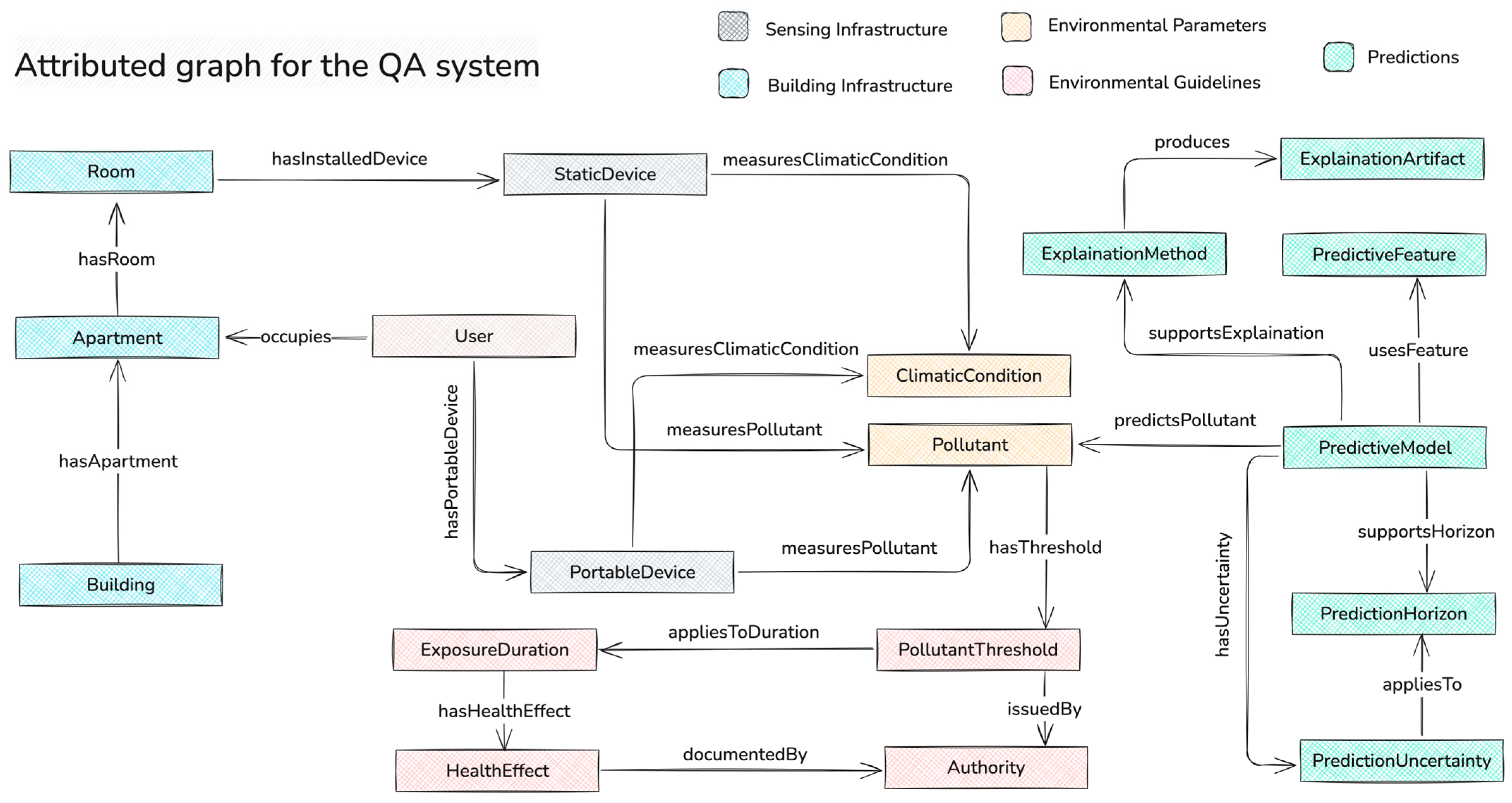 - A structured semantic representation of key entities and their relationships for the IAQ domain through a flexible and scalable KG schema, including air pollutants and climatic conditions, sensor and building infrastructure, environmental and health guidelines, and IAQ predictive models.