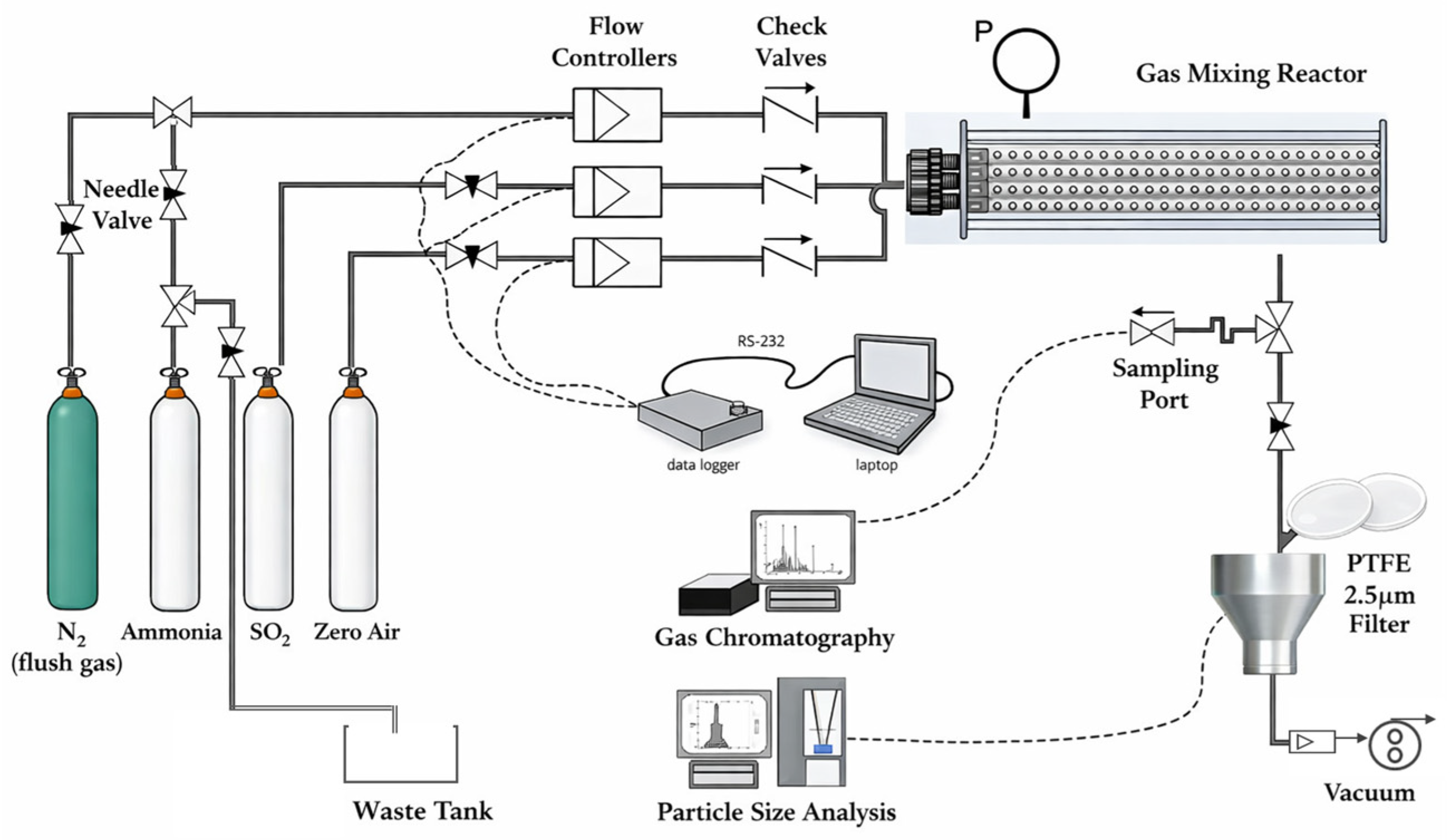 23] emitted in trace quantities from livestock facilities. Rather than attempting to replicate ambient atmospheric conditions or resolve detailed chemical reaction mechanisms, this study aims to demonstrate controlled gas-to-particle conversion, characterizing the physical and chemical properties of the resulting aerosols, and empirically relating NH