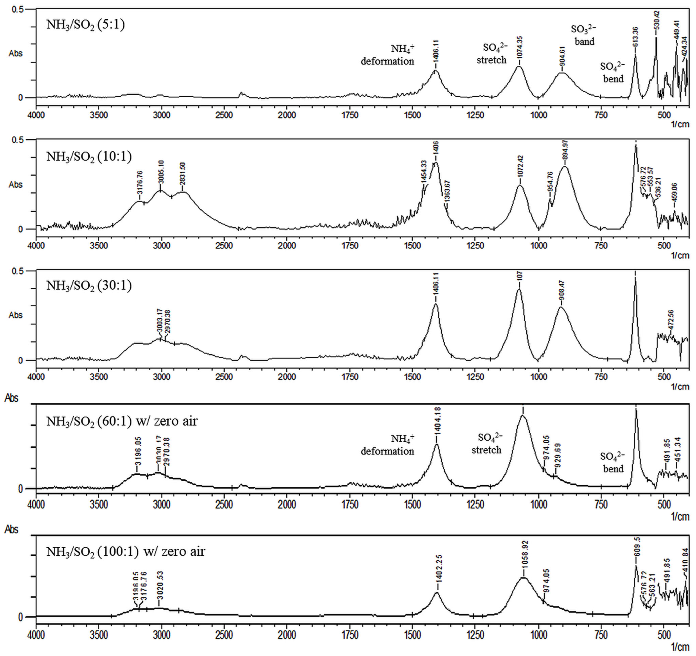 Additional absorption features at lower wavenumbers were observed in no-zero-air conditions, consistent with the presence of sulfite-related intermediates. In contrast, PM collected in the presence of oxygen exhibited FTIR spectra that more closely resembled ammonium sulfate, with diminished sulfite-associated features, indicating preferential formation of oxidized sulfur products under oxygen-rich conditions. These observations are consistent with the known oxidation of sulfite to sulfate in NH