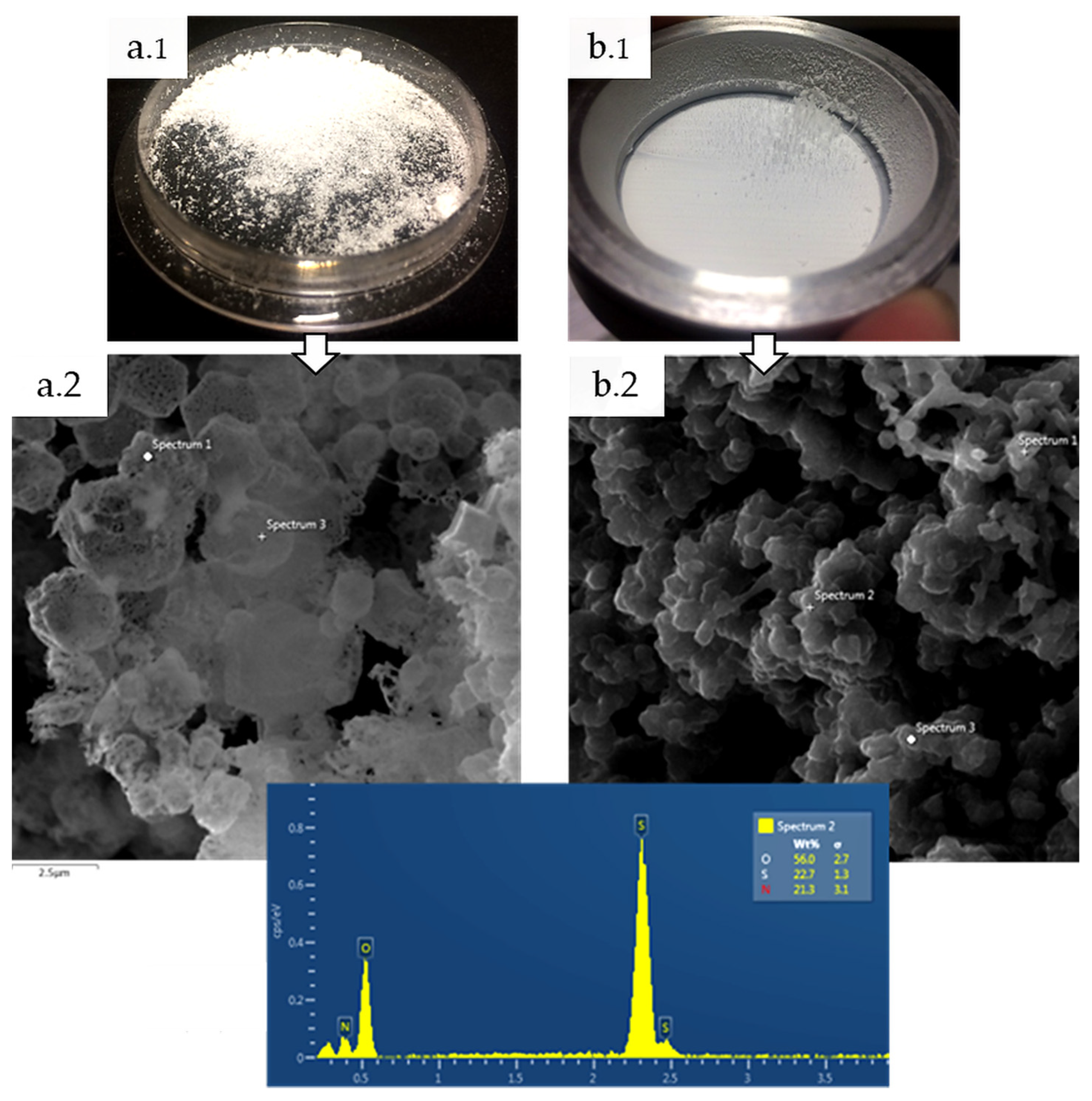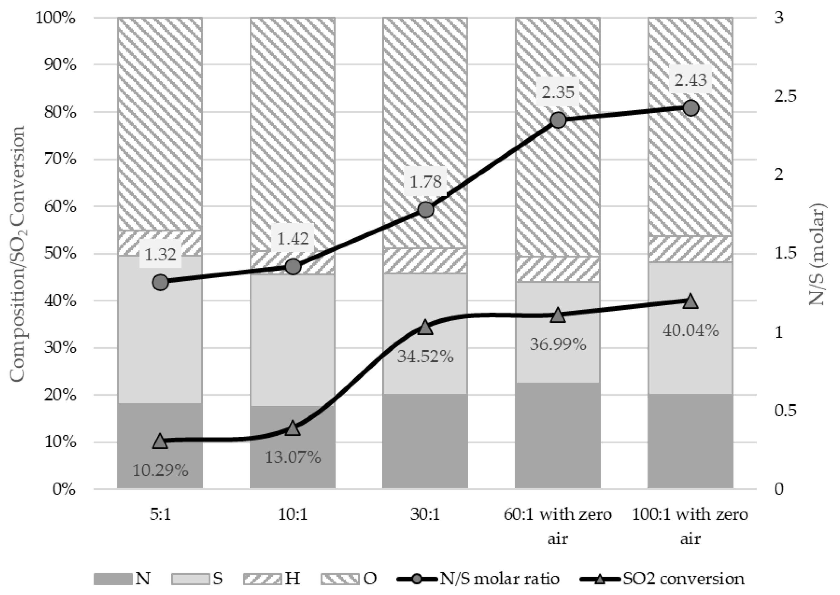 2 conversion efficiencies, calculated from sulfur recovered in the particulate phase using Equation (2), were approximately 35% in the absence of oxygen and ~40% under oxygen-rich conditions. These values are intended as qualitative indicators of effective gas-to-particle conversion under ammonia-rich conditions rather than as kinetic descriptors. The PM formed without oxygen exhibited an N/S molar ratio of approximately 1.78, while higher NH