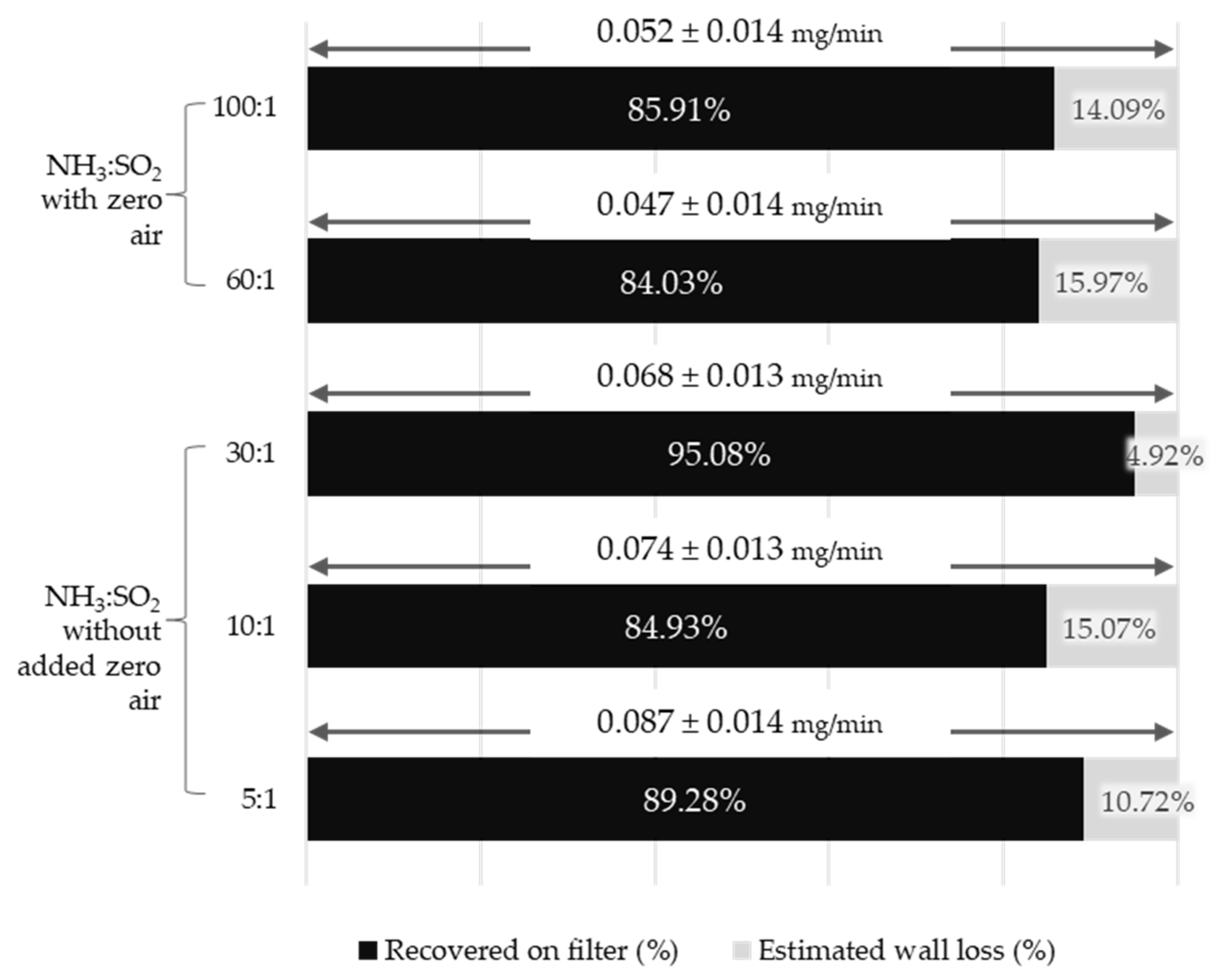Overall, these results demonstrate that NH3–SO2 reactions under all tested conditions produced measurable particulate matter, while underscoring the importance of accounting for particle wall losses when quantifying PM yields in flow-reactor systems. The corrected PM production rates therefore represent more robust, yet still conservative, estimates suitable for comparative and screening-level assessments of secondary PM formation.