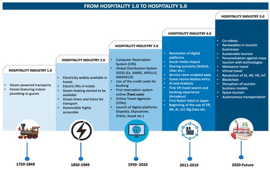Research suggests that the hospitality industry experienced five technological revolutions, parallel to industrial revolutions, each of which significantly changed the business model, as shown in Figure 1 [51]. The fourth revolution, inspired by Industry 4.0 technologies such as AI, chatbots, IoT, AR, VR, and big data [52], had a profound impact on transforming the hospitality business model. This ongoing transformation is further driven by the emergence of Hospitality 5.0, which focuses on sustainability, enhancing the tourist experience, and strengthening the resilience of the sector, setting the stage for disruptive business models in the future of the tourism industry [51,53].