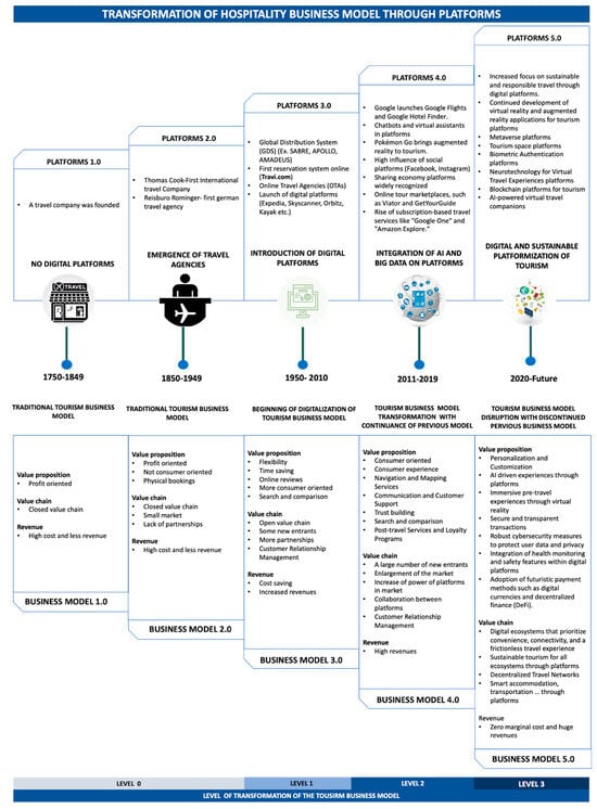The hospitality business model has undergone profound changes influenced by successive waves of technological advances and platforms. This paper explores how different waves of technologies and platforms are shaping the evolution of the hospitality business model. Employing a systematic literature review, this research analyzes how platform innovation has driven significant shifts in the industry. The analysis yielded four key findings. Firstly, the incorporation of digital technologies resulted in a radical transformation of conventional business models, prompting substantial alterations in marketing strategies, distribution processes, and consumer behavior patterns. Secondly, the industry has undergone five significant technological revolutions, evolving from steam-powered transportation to the integration of artificial intelligence (AI) and the Internet of Things (IoT), thereby driving a shift towards innovation-centric business models. Thirdly, the advent of digital platforms, most notably online travel agencies (OTAs), posed a challenge to traditional hospitality models by introducing personalized experiences and disrupting established market norms. While digital platforms offer advantages such as enhanced convenience and customization, they also present challenges, including intensified competition and declining profit margins. Nonetheless, technological advancements such as AI, virtual reality (VR), and augmented reality (AR) present a potential avenue for redefining value propositions and enhancing customer experiences. Fourth, the future of the hospitality business model is poised for further disruption, influenced by the emergence of new virtual platforms and services. This could potentially result in a reshaping of the industry’s value chain and value proposition.