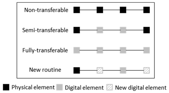Figure 1 schematically presents the identified routine types, based on their potential to be transferred onto platforms. As can be seen, the first case refers to non-transferable routines whose implementation is not affected by platforms. The following two cases refer to existing routines, which can be either partially or fully delivered through platform-based technologies. Finally, the fourth case represents the case of a new routine emergence, where existing physical and digital elements co-exist with new digitally enabled tasks. This is the most interesting but also the most difficult case to find, as it embeds an innovative character for the developmental potential of a region.