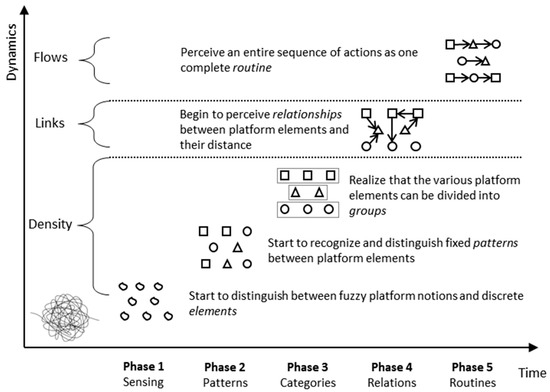 Considering that routines play a pivotal role in the conversion of platforms into proximity generators, the outlined learning process should prioritize a comprehensive grasp of the effective integration of platforms and routines. In the initial stages, regions not yet immersed in the realm of platforms face challenges in distinctly identifying the individual components. Thus, Phase 1 marks the shift from a vague comprehension of platforms to a more nuanced perception, empowering regions to discern specific functions and crucial elements associated with them. During this phase, regions begin to recognize the emergence of something novel and become increasingly attuned to new experiences stemming from these aspects. For example, a region transitioning through Phase 1 may initially perceive social media platforms as mere communication tools. However, as the phase unfolds, they start recognizing the platform’s potential for community building, information dissemination, and public engagement. Previous studies have highlighted the role of social media platforms as enablers for community building and development [61]. Over time, these platforms contribute to the gradual accumulation of social capital within a region, fostering stronger social connections and collective engagement [62]. This heightened awareness allows the region to adapt and explore new possibilities, laying the groundwork for a more informed and purposeful utilization of platforms in subsequent phases.
