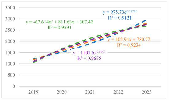 The historical financial statements indicate that the company’s operating revenue has shown a rapid growth trend from 2019 to 2023, as shown in Table 3. This paper conducts linear regression prediction, quadratic regression prediction, exponential regression prediction, and power function regression prediction for the operating revenue from 2024 to 2028 and compares the fitting effects of the models. The R-squared values are 0.9234, 0.9593, 0.9121, and 0.9675. Since the closer the R-squared value is to 1, the better the fitting effect is, the power function regression prediction with the best fitting effect is selected, with an R-squared value of 0.9675. Therefore, the obtained operating revenue prediction formula is as follows (see Figure 1). The predicted results of operating revenue are shown in Table 4.