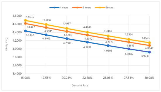 The determination of the discount rate for data assets requires the consideration of numerous influencing factors, and it is difficult to distinguish from the discount rate for intangible assets, resulting in significant uncertainty. The market comparison method, risk accumulation method, and weighted average cost of capital (WACC) method are the most commonly used approaches for determining the discount rate []. This paper adopts the weighted average cost of capital (WACC) as the basis for calculating the discount rate. First, the arithmetic average of the weighted average cost of capital (WACC) of the assessed enterprise is calculated. Second, the return rates of fixed assets and current assets are deducted from the overall return rate of the assessed enterprise to derive the return rate of intangible assets.