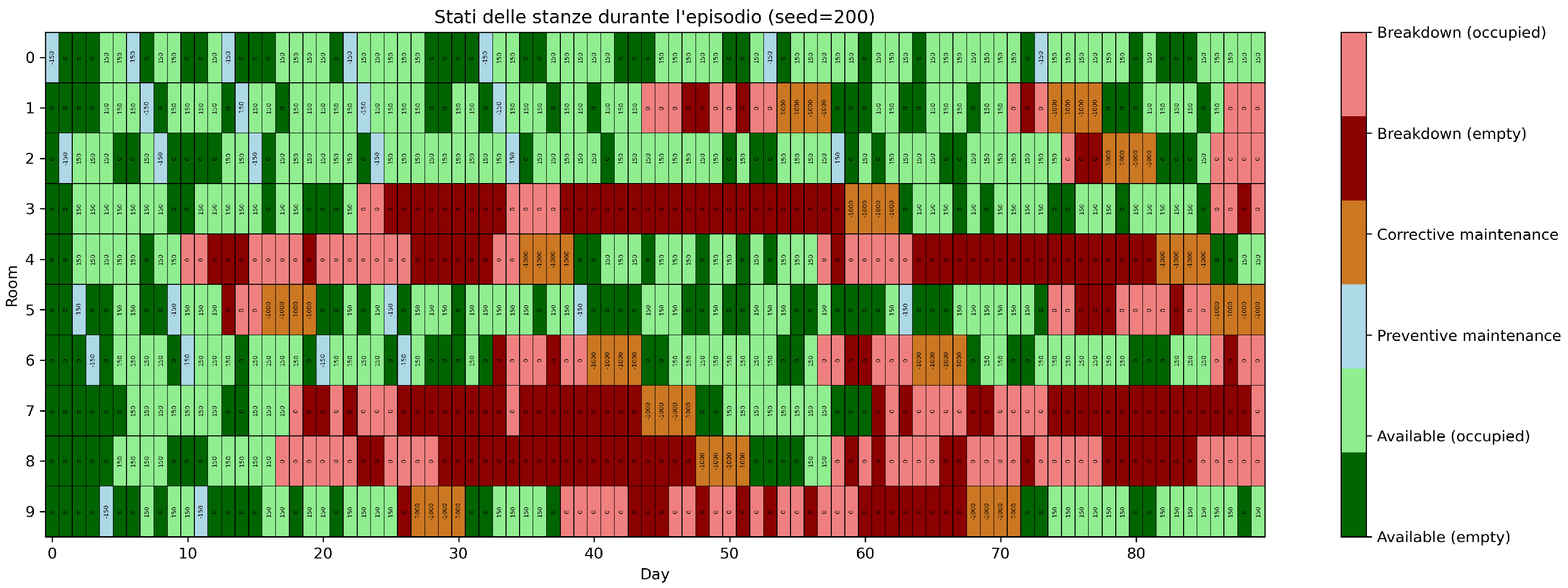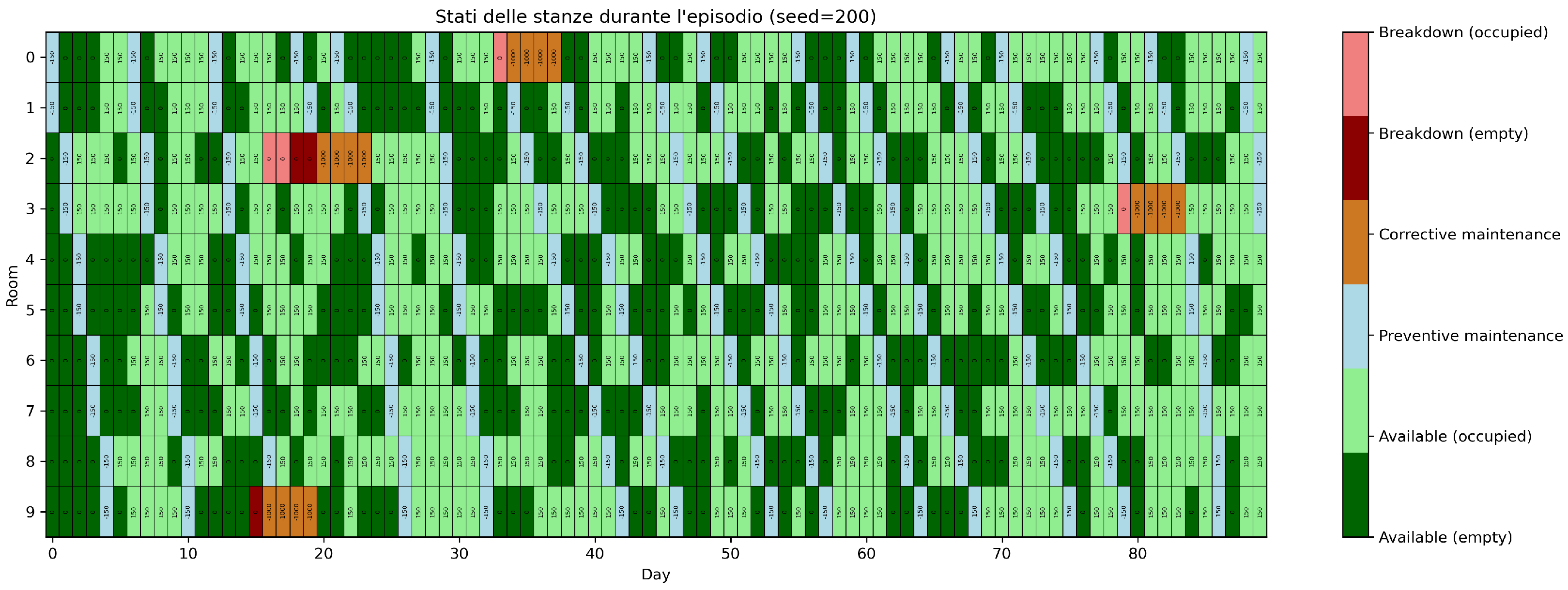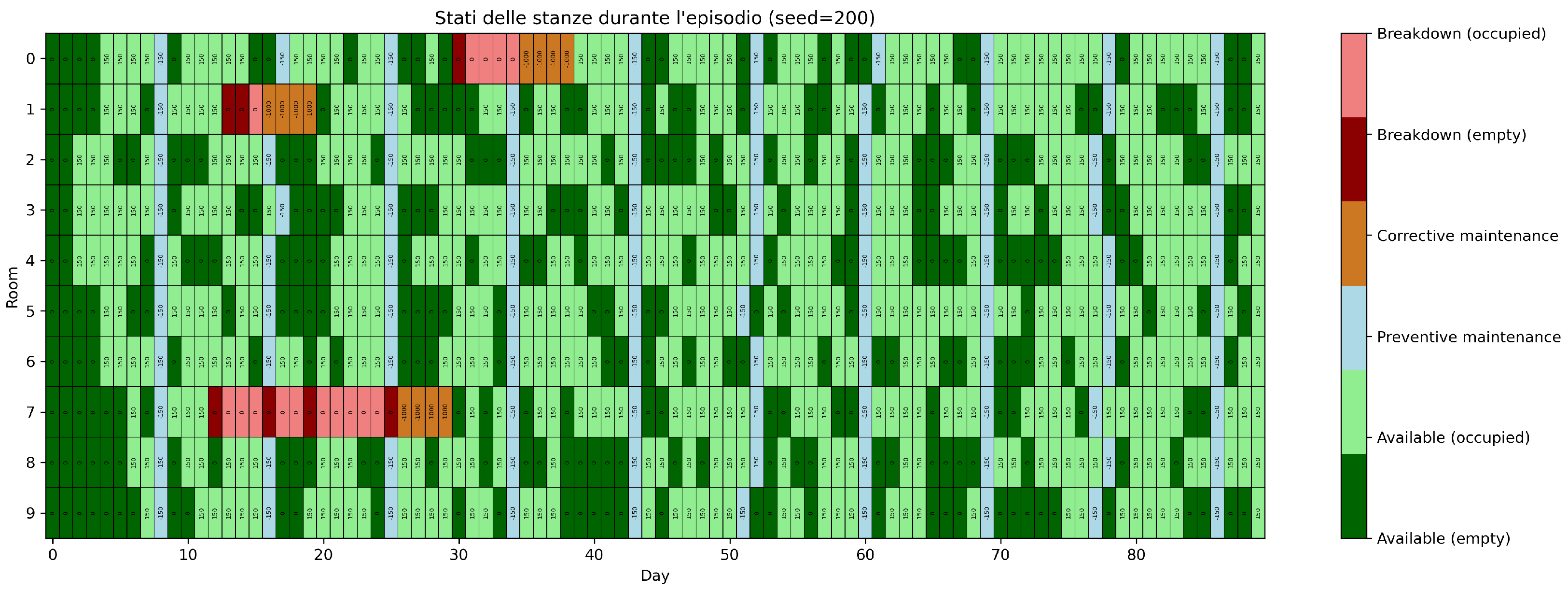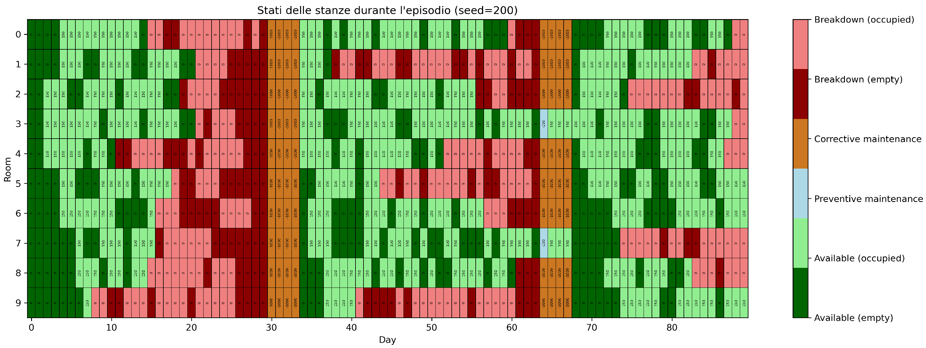 - State heatmaps For selected evaluation episodes and seeds, custom heatmaps are generated to visualize the temporal evolution of each room’s operational state. Each cell encodes the state (available, occupied, preventive maintenance, corrective maintenance, breakdown with or without guest) using a dedicated color map. This enables rapid, qualitative inspection of emergent maintenance strategies and identification of operational bottlenecks, such as clustered breakdowns or suboptimal intervention timing.