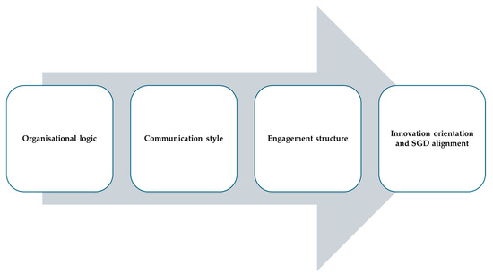 Transaction Cost Theory explains how organisations minimise the costs of coordinating innovation activities through governance mechanisms and structural design [55]. The coupling of platform governance and communication interfaces provides a lens for understanding how organisational logic translates into discursive practice. Governance extends beyond rules and incentives, as platforms also govern through communication design—interfaces, narratives, and tone—which shape how participants perceive legitimacy and authority [56,57]. Communication, therefore, functions as a governance tool: it signals who belongs, what counts as innovation, and how sustainability is framed [22].