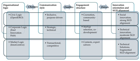 For example, inclusive and emotionally resonant communication (as in OpenIDEO) fosters broad, co-creative participation, resulting in outcomes aligned with social innovation and the SDGs. By contrast, technical or reward-driven communication (as seen in Enel Innovation Hub and InnoCentive) encourages selective, expert-oriented participation, resulting in targeted but narrower innovation outputs.