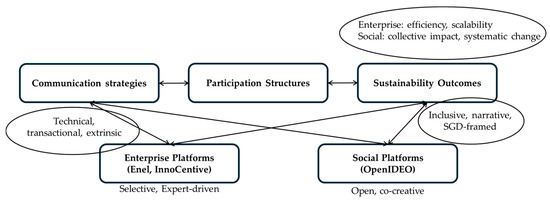 This integrated framework directly informed the coding categories (Supplementary Materials S1 and S2) and the comparative analysis of OpenIDEO, San Francisco, CA, USA; Enel Innovation Hub, Rome, Italy; and InnoCentive, Waltham, MA, USA.