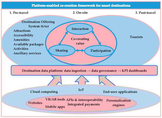 Platform-enabled co-creation in smart destinations across the visitor journey (pre-travel, on-site, and post-travel). Source: Created by the authors, and grounded in smart tourism and smart DMO literature [6,7,8,9,31,32,33,34,35] and destination offering and competitiveness frameworks [18,19,30].