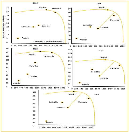 The corresponding efficient frontiers, which reflect these Technical Efficiency patterns in terms of tourism revenue and overnight stays, are depicted in Figure 2.