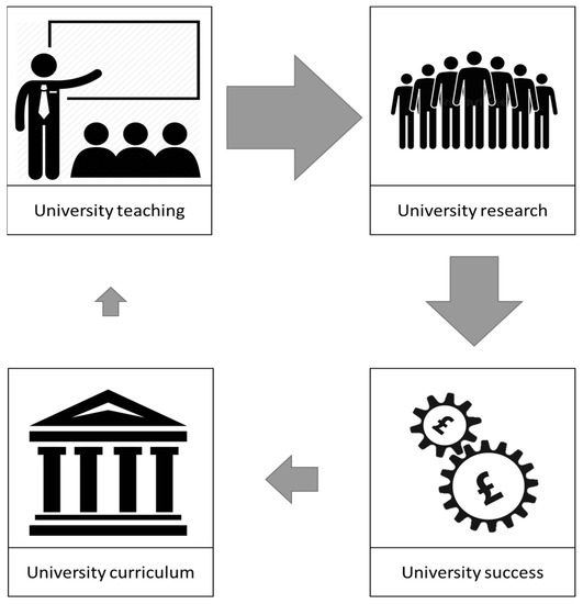 The so-called impact agenda that concurrently represents a hallmark of Western Higher Education institutions, has institutionalized a utilitarian view of knowledge production through evaluation regimes [7]. From a viewpoint of traditional Higher Education, this clashes with an emphasis of pedagogy over ideology. Hence, the aim of this paper is to conceptually clarify how the two approaches differ in their relation to pedagogy and explore their influences on student education [8]. Specifically, the research question is: what are the feedback loops of these different processes, and how do they influence university student pedagogy intergenerationally? The paper has five interconnected research objectives. Firstly, to outline the constraints on university teaching; secondly, to describe the boundary conditions of university research; thirdly, to clarify the role of university funding success; fourthly, to describe the ingredients in the university curriculum formation; and finally, to discuss the feedback loop of how these different aspects influence each other intergenerationally.