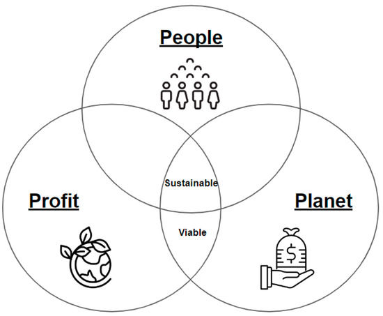Sustainable entrepreneurship has gained momentum over the last few years. It has has gained interest with a new paradigm shift in entrepreneurship instruction, moving from traditional perspectives towards sustainability inclusions [8]. The Education for Sustainable Development (ESD) aims to create awareness of sustainability among students. This is achieved by empowering students with “sustainability competencies through a holistic, interdisciplinary perspective of content and pluralistic learner-centered democratic teaching strategies” [9]. In education, the sustainability triad (Figure 1) has been used as a pedagogical framework for teaching and learning sustainability-based concepts in the classroom [10], consisting of three main dimensions, namely society, economy, and environment [11]. The triad has been used as a teaching approach, yet very little is known about the extent of its implementation in classrooms and its impact on student learning.