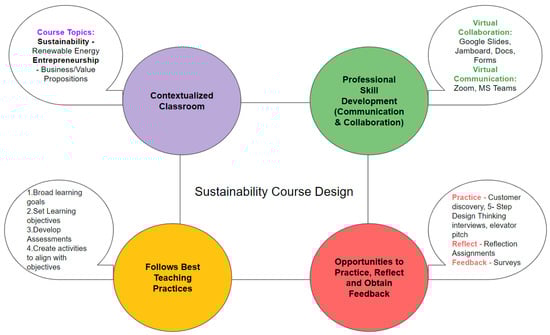 In line with the need to reform and re-invent education for sustainable development [4,24,26], the authors provide an approach to teaching sustainable entrepreneurship in a virtual setting by collaborating with instructors and students from multiple countries and disciplinary backgrounds. Additionally, this approach provides students with opportunities to develop systems thinking skills and become experts in their professional or research disciplines to solve complex sustainability problems in the community. By being purposeful in designing the curriculum, the course structure was based on the framework of the four intentions for cultivating the entrepreneurial mindset [14]. This included contextualized classroom (e.g., sustainability and entrepreneurship context), professional skill development (e.g., communication and collaboration), opportunities to practice (e.g., customer discovery, elevator pitch, design thinking, and interviews), reflecting and obtaining feedback, and following best practices for teaching (e.g., backward course design).