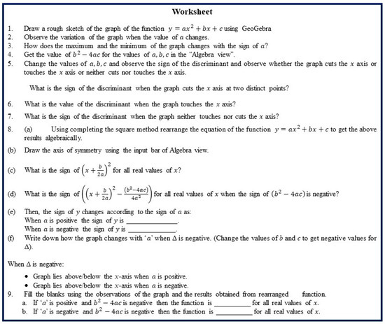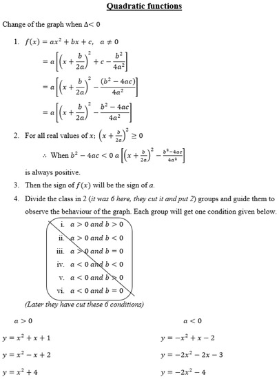 The teachers of Group C were all in the age group 31–40 years, having less than five years of teaching experience, and holding a bachelor’s degree with a substantial component of mathematics. The main goal of the task they chose was to help students to understand the variation of the graph of a quadratic function in the form of when the discriminant () is negative (see Figure 1). It is more like a set of teacher notes rather than a task designed for students. The task provides the steps needed to rearrange the function using the method of completing the square. Following that, the argument that determines how the sign of the given expression depends on the sign of when is given. Two sets of functions for each condition, and , are given for students to draw the graphs. There is no mention of using DT, no direction to find a generalisation, and no evidence that students were guided to investigate and interpret their findings.