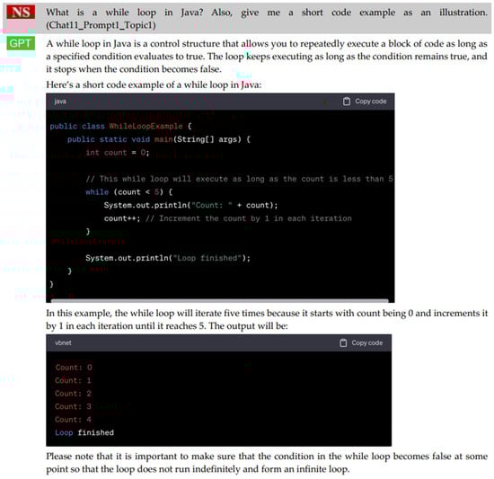 So, as part of the first lesson, I asked ChatGPT about the meaning of the term programming. ChatGPT provided an overview of the definition, functionality, and meaning of programming in computer science. Since I was educated as an environmental engineer, questions remained open; I iterated, driven by curiosity about the impact of programming in industry during the last 20 years and which areas could be influenced by it substantially. As a result, ChatGPT generated a text more than one screen long, which referred to the increasing digitalization process of the industry—Industry 4.0—and presented new professional fields opened up by it. In conclusion, there was a longer chat with ChatGPT in which I worked out the topic according to my own interest on the basis of the generated curriculum and let ChatGPT prepare and structure the content and visualize it by generating code examples (see Figure 1).