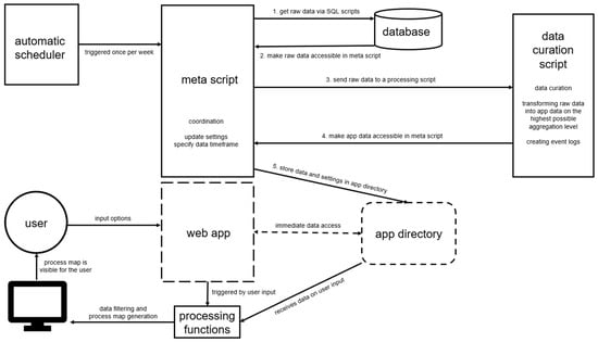 The project is located in a directory on a web server and contains two major components: (1) data curation and (2) the web app. The web app is constantly running and can be accessed via a webpage. It uses data that has previously been brought in a format that ensures fast processing. An automatic scheduler triggers these data updates once per week. This is done by starting a meta script, which coordinates all the steps until the data is ready to be accessed by the web app. It sets up the data processing environment, based on the current date. This is important, as only data within a target timeframe of ten academic years plus the current academic year should be included. The meta script then loads the SQL files, adapts their filters to this timeframe and runs them. These SQL scripts connect to the database, query the data and feed it back to the meta script. In the next step, the raw data is sent to the main data curation script. The data is then filtered, cleared and aggregated on course and program level per student. This means that each student can have several rows per study program, with each row containing one exam. Using the names of the exams, dates and time values, rows are transformed into an event log format. The results are sent to the meta script, which stores the data and updated settings in the app’s directory on the web server. Every time the URL is accessed, the web app loads the data from the directory, making it immediately accessible in a user’s session. Upon user input, the web app triggers processing functions, making the data from the app directory accessible. Depending on the user input, different functions filter the data, e.g., on a specific curriculum level, and generate the process maps. The maps are then displayed on the screen, visible to the user.