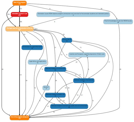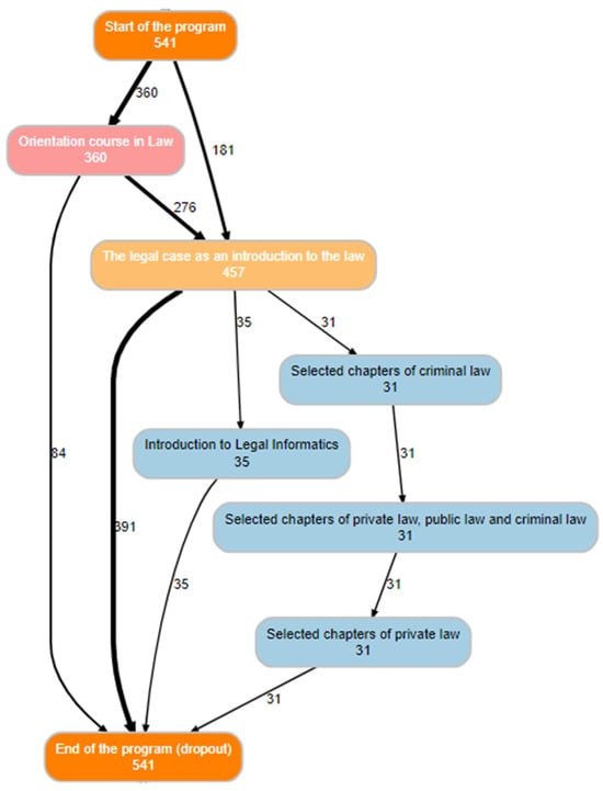 Each plot should be read by starting at the “start of the program” node. The number beneath the title represents the number of student pathways included in the plot. From there, the pathways branch out and create different traces, showing the course sequence of students. Each trace also depicts the number of students that transition from one exam to the next. Thicker traces indicate higher frequencies. Red and orange color coding does the same for nodes, while light blue and dark blue is used for lower frequencies. Following the bold black traces, the “main course sequences” with the highest frequencies can be identified. Figure 2 for instance, shows that 541 students fulfilled the criteria defined in the settings as dropping out after taking between one to five courses. Among them, 360 students got a grade in the “Orientation course in Law” as their first course and 181 took “The legal case as an introduction to law” first. Following those 360 students, 276 of them then got a grade in “The legal case as an introduction to law” course, while 84 closed their program without taking another exam. Of the total of 457 students taking the exam in this introductory course, an additional 391 students closed their studies afterwards. Others did some other courses with lower frequency measures, but ended up dropping out after a maximum of five courses as defined in the settings in the user interface. In comparison, Figure 3 shows successful students with a graduation. Their course sequences are cut off after their first five courses. Via the settings, the cutoff can be increased.