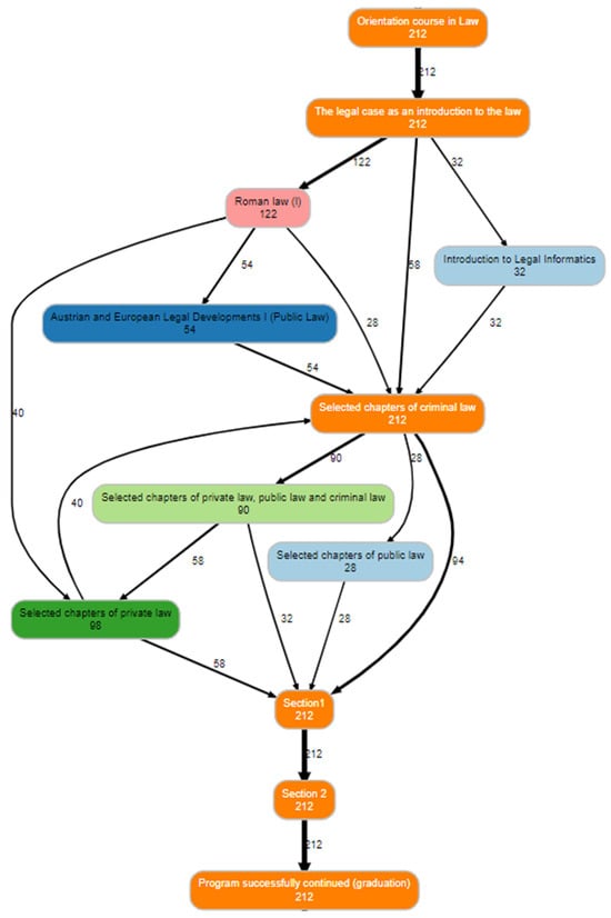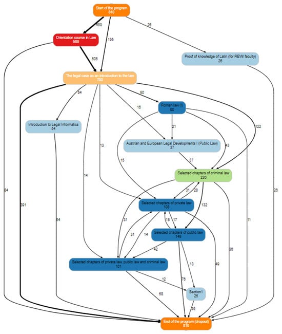Implementing failed exams and passed exams as another variable can add information to the proposed approach. However, at the current state of the implemented R packages, no distinctive visual highlights can be defined to visualize these differences (e.g., by color coding). It is possible to include a switch that either only displays successfully passed and failed exams or to include the outcome in the name of the courses, e.g., “Orientation course in Law (passed)” and “Orientation course in Law (failed)”. By doing so, the process map layouts would change. On the one hand, by implementing a switch only failed sequences could be displayed, leaving out the rest of the (successful) pathway a student takes. On the other hand, including exam outcomes in the course names would double the size of the process maps, which is not optimal, considering the size increases that already happen when adjusting the settings to display all of the pathways of students with five courses to six or seven courses. At the University of Graz, other tools and analyses have been created that can be used in conjunction with the process maps, allowing for a better presentation of individual course metrics.