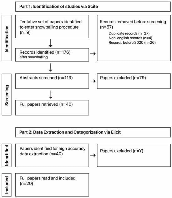 The research framework was operationalized through a methodical two-stage literature review (see Figure 2). The initial stage harnessed a systematic methodology that began with the formulation of targeted search keywords. These terms were chosen to capture the essence of the pandemic’s impact on architectural education: “architecture”, “online studio”, “COVID”, and “post-COVID”. A comprehensive search through “Scite”, a smart citation index, set the groundwork for an expansive literature snowballing process, refining the initial set of 9 seminal papers to a significant corpus of 176 related works.
