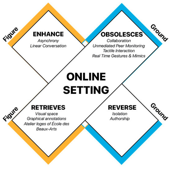To understand this inclination and/or resistance, it is crucial to heed Marshall McLuhan’s dictum that changing the medium also alters the message. The expression “the medium is the message” is based on McLuhan’s idea that not the medium’s content but its characteristics affect the society in which it is active. The media exert these effects by reshaping the ways in which individuals, organizations, and cultures perceive and understand their environments. McLuhan’s use of the term “media” encompasses all types of technology and tools, as they are extensions of some human faculty—psychic or physical [48] (p. 26). Hence, his understanding of media encompasses every physical or virtual extension of humans; it allows his tetrad to be applied to any context, in this case, “the online design studio”.
