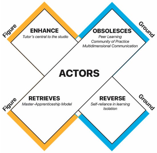 An architecture studio is an open space that supports various teaching and learning activities, such as lectures, individual meetings, group projects, and various critique methods [65] between its actors through formal and informal communication. With the shift to online education, there were infinite communication channels and types connecting individuals, educators, stakeholders, and specialists. Technology necessitates the functional change and improvement in the learning experience, as opposed to solely replicating offline learning activities and requiring a redefinition of delivery tools and methods [9,17,19,24,25] as blended or hybrid delivery scenarios and enabling information and knowledge sharing across a vast network of resources and people. It is important to note that the tools and techniques of both physical and virtual learning are constantly advancing in conjunction with each other, providing a wider range of knowledge and skill-building opportunities [17].