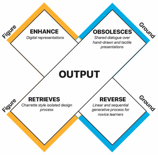 In the transition from material to virtual spaces, the tactile, sensory experience traditionally integral to architectural education was replaced by a more visually dominated interaction, as illustrated in our results. This observation aligns with those of Grover and Wright [22], who reflected on the limitations imposed by the absence of physical materials and their impact on student learning outcomes. However, this study extends this understanding by employing McLuhan’s tetrad to dissect these changes, revealing that, while certain communicative dynamics are rendered obsolete, new forms of participation have emerged.