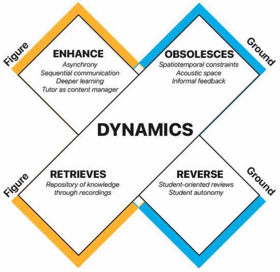Theoretical Alignment with McLuhan’s Tetrad: In accordance with McLuhan’s framework, these archetypes are critically examined through the lens of the tetradic effects—enhancement, obsolescence, retrieval, and reversal [34]. This analysis allows for a detailed understanding of how the migration to online educational platforms has reconfigured these foundational pedagogical elements.