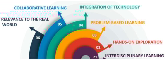 This approach (Figure 1) not only promotes a deeper understanding of core concepts but also cultivates essential skills such as communication, teamwork, and adaptability. STEM education breaks down the traditional silos between subjects, allowing students to see the connections between science, technology, engineering, and mathematics. Students engage in hands-on activities, experiments, and projects that encourage active learning and the application of theoretical concepts. STEM education emphasizes problem-solving skills by presenting students with real-world challenges that require critical thinking and creativity to solve [18,19,20]. Technology is integrated seamlessly into the STEM curriculum, enabling students to leverage tools and resources to collect data, analyze information, and design solutions. STEM encourages collaboration and teamwork, reflecting the interdisciplinary nature of modern workplaces where individuals with diverse skill sets must work together to achieve common goals. STEM education nurtures creativity and innovation by empowering students to explore multiple solutions to problems and think outside the box [21,22,23]. STEM learning experiences are designed to be relevant and applicable to real-world contexts, preparing students for future careers in STEM fields and equipping them with the skills needed to address global challenges.