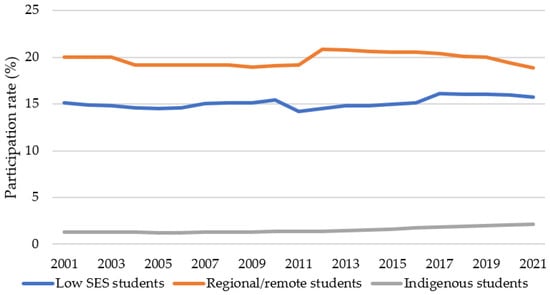 Figure 1 gives the proportion of domestic undergraduate students enrolled in these categories over the period 2009 to 2021, which includes students at all levels of their course. Earlier participation rates have been added to the graph for the period 2001 to 2008 to take the comparison to a 20-year time series, noting that not all data for earlier periods are compiled using precisely the same definitions [11,20]. While there is some fluctuation, the figure shows that the participation rates for most of these equity groups have remained relatively static over the period and have generally not reached the proportions required to achieve parity with the Australian population. This is particularly the case in regard to participation rates for low SES students which have remained at about 15 to 16% since 2001.