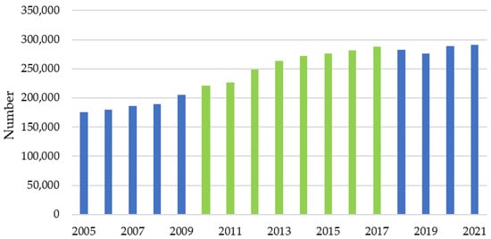 Number of commencing domestic undergraduate students, 2005 to 2021 [55].