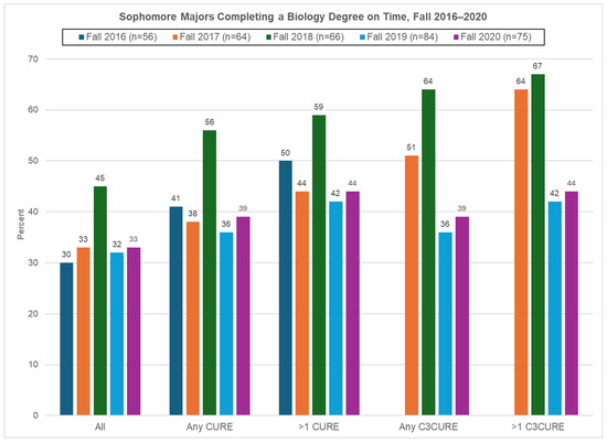 In this section, we take up the question of whether completion of either CUREs or C3UREs had a measurable impact on the persistence of biology majors through completion of a bachelor’s degree. Figure 3 displays outcomes for sophomore biology majors in five successive fall semesters, spanning a period from before the introduction of C3UREs through the effective end of our grant-funded project.